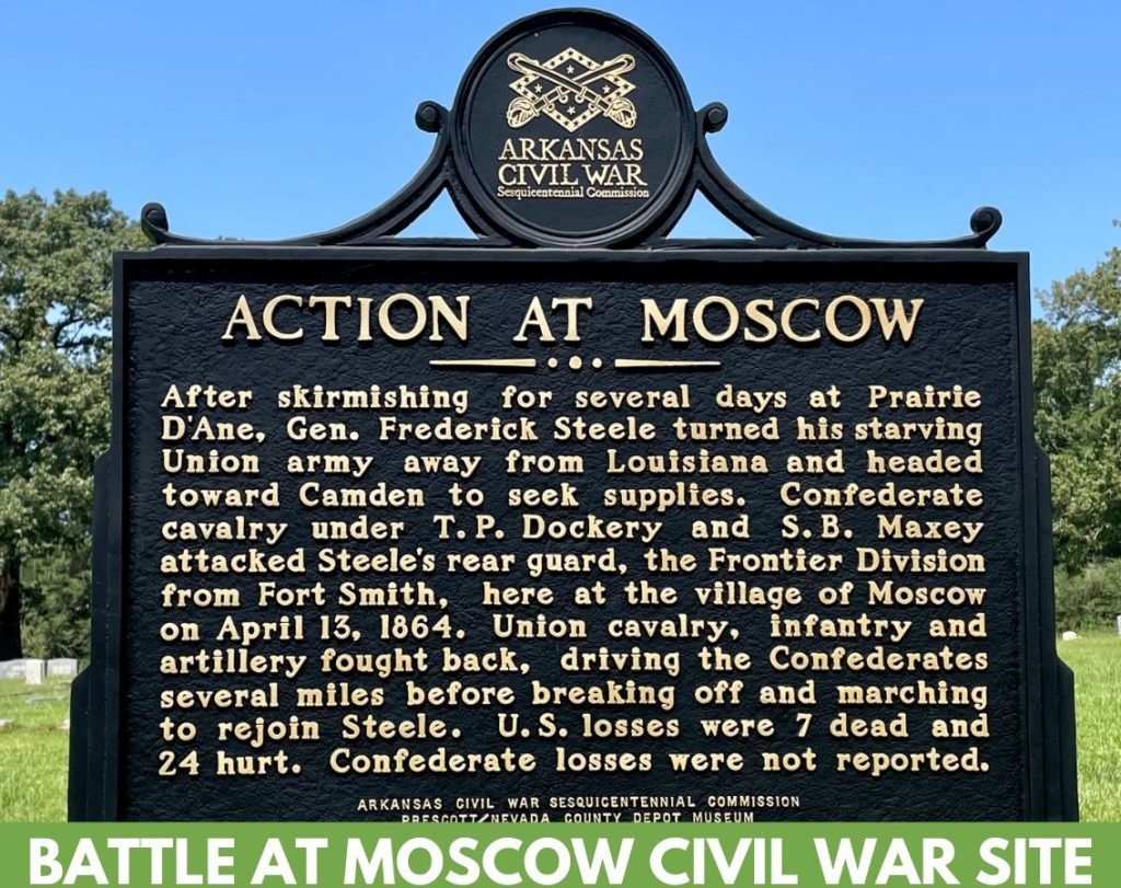 April 13,1864. Confederate cavalry under Brig. Gen. Thomas Dockery attacked Steele’s rearguard at Moscow as Steele moved toward Camden. Thayer’s Union forces managed to repel the Confederate attackers and then rushed to join Steele on the road to Camden.