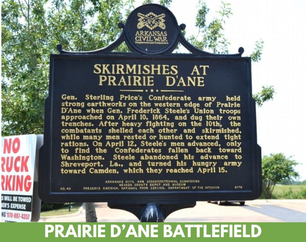 The Prairie D’Ane Battlefield (north of Prescott) was the scene of heavy skirmishes during the spring of 1864, when Southern soldiers sought to drive the Union soldiers toward the Red River. The pasture land still looks much as it did in 1864. It was declared a National Historic Landmark in 1994.